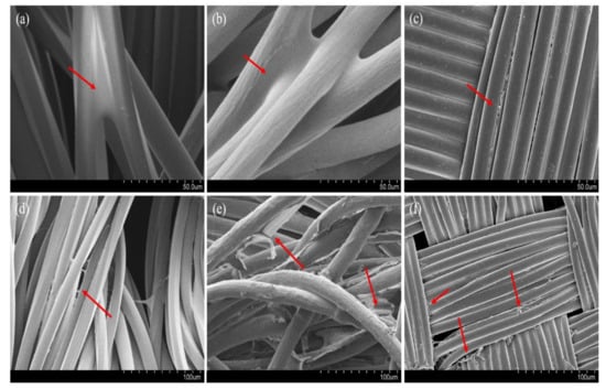 Chitosan pretreated garment surface before ((a) PEs, (b) AC and (c) PA) and after washing ((d) PEs, (e) AC and (f) PA). Red arrows are chitosan film.