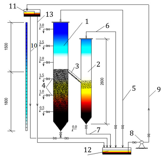 The installation consisted of two cylindrical columns: clarifier with suspended layer (1) and sludge thickener (2). Clarifier with a diameter of 200 mm and total height of 3.3 m and a sludge thickener with a diameter of 150 mm and total height of 2.6 m were made of organic glass and interconnected by a sludge discharge pipe (3) with a diameter of 50 mm, located 1.8 m above the bottom of the clarifier. On the wall of the CSSL, at intervals of 0.5 m, four sampling nozzles were installed. The clarified water was discharged from the top of the clarifier through pipeline (5) with a valve to control the flow of water passing through the clarifier and the velocity of the upward flow. The sludge thickener was equipped with supernatant discharge (6) located at the top and thickened sludge discharge (7) located at bottom of the unit. The CSSL unit was supplied with biologically treated effluent from TFs, which was pumped from effluent channel (12) to an elevated reservoir serving as flow equalizer (11), installed at a height of 4.4 m. The excess water was discharged from the flow equalizer through an overflow pipe (13) to discharge channel (12).