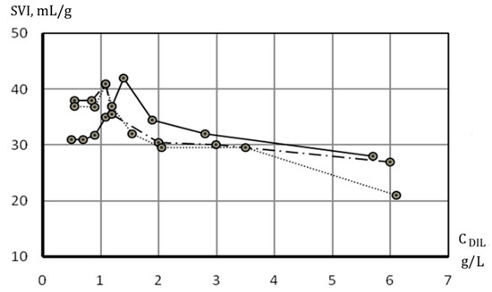 The sedimentation properties of the biofilm sludge forming the suspended layer were evaluated by the sludge volume index (SVI), which was determined as follows: the same volume of sludge taken from the suspended layer was diluted with pure water 2, 3, 4, 5, 6, 7, and 8 times and the concentration of total suspended solids in each diluted sample was determined (CDIL, g/L). Diluted samples were left for sedimentation in standard vessels with a capacity of 1000 mL for 30 min. After this time, the volume of settled sludge was recorded (V30, mL/L). The sludge index for each sample was determined as the ratio: SVI = V30/CDIL (in mL/g). Obtained results were used to create graph of SVI = f(CDIL) relationship that was used for monitoring of SVI in the model during experiments (Figure 2).