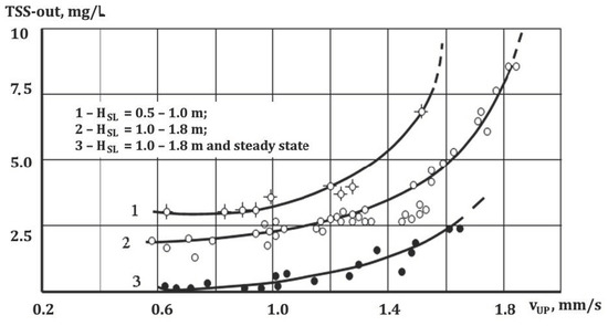 Analysis of the graphs show that with HSL > 1.0 m, for vUP ranging from 0.6 to 1.6 mm/s, TSS-out was less than 6 mg/L, which is a significantly lower value than that observed in conventional secondary settling tanks. The graphs also show that for velocities over 1.6 mm/s there was a rapid growth of TSS-out (line 2, Figure 4), which confirms earlier findings that velocities ca 1.8–1.9 mm/s may be considered as critical in terms of the washout of sludge from the CSSL.
