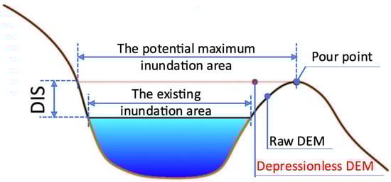Esri [] and Wu et al. [] introduced a fast and straightforward solution to identify the open-water area or the wetland depression by using the “filling-and-spilling” method. The “filling-and-spilling” method is simply subtracting a raw DEM from a depressionless DEM (the DEM without sinks). Sinks are defined as topographic locations that are at a lower elevation than all neighboring cells. The difference between the depressionless DEM and the raw DEM is called Depth in Sink (DIS) in the study of Antoni et al. []. This approach can delineate open-water wetlands because the definition of sinks is wholly consistent with the definition of wetland depressions []. Therefore, the open-water wetlands are where the pixel value of DIS is bigger than 0. Some studies [,,] also show the application of the “filling-and-spilling” conception for the wetland delineation.