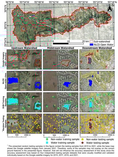 As shown in Figure 1, the whole watershed can be delineated into three sub-watersheds []. The upstream sub-watershed of the Cypress Creek watershed is mostly natural and agricultural areas, and the midstream sub-watershed is mixing the agricultural area with the residential area. The residential area with estimated 216,000 residents is located within the downstream sub-watershed []. The Cypress Creek watershed experiences about two to three flooding events per year on average. For example, it experienced devasting floods during Hurricane Harvey in August 2017. During that event, 82 people died and estimated economic losses were about $180 billion []. Therefore, the Cypress Creek watershed is chosen as the study area to delineate the existing open-water wetlands that will be further used for flood mitigation purpose.