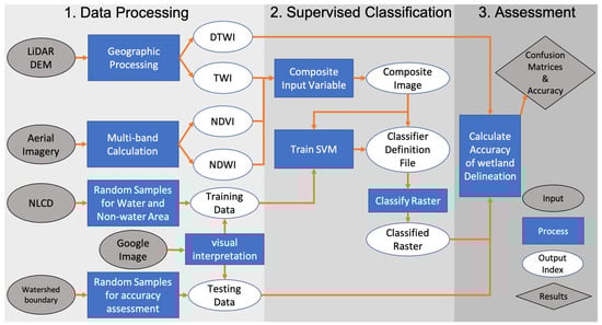 Among the remotely sensed data, the most widely used datasets are optical imagery and Light Detection and Range data (LiDAR) [,]. The optical imagery is usually collected by passive optical sensors installed on satellite or airborne platforms such as Landsat satellite imagery and National Agriculture Imagery Plan (NAIP) aerial imagery. The optical imagery contains the different electromagnetic spectrum bands, namely visible bands such as Red, Green, and Blue, and invisible bands such as near-infrared (NIR), shortwave infrared, and the thermal infrared. Wetlands can be extracted by analyzing the signature differences of the spectrum between different land cover types such as waterbody, vegetation, urban, etc. Unlike passive optical sensors installed on satellite or airborne platform, the LiDAR is an active laser scanning system. The LiDAR sensor can emit laser pulses to the ground surface and record the reflection time to calculate the ranges to the ground surface. Combined with other data recorded by the operational platform such as longitude and latitude, the precise three-dimensional information of topography can be produced in the form of LiDAR point clouds []. Sequentially, based on a certain interpolation algorithm, high-resolution digital elevation models (DEMs) can be then derived from LiDAR point clouds. More significantly, the LiDAR-based DEMs can be used to compute various topographic metrics which can be helpful for mapping wetlands.