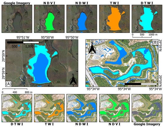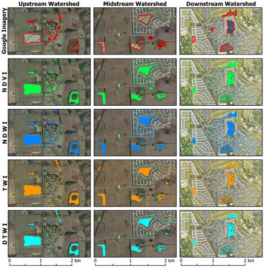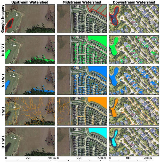 At the same locations presented in Figure 3, Figure 5 below shows the inundation area of the existing open-water wetlands delineated by the four indices mentioned above (NDVI, NDWI, TWI, and DTWI) in the upstream, midstream, and downstream sub-watersheds of the Cypress Creek watershed. According to the results, visually, all four indices can successfully delineate most wetland areas in the natural and residential areas and show similar patterns of waterbody delineation. However, it should be noted that although the NDVI and the NDWI can successfully delineate the wetland areas, they also give a higher response to city infrastructures and shadows, especially the roofs of buildings.