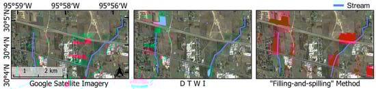 Figure 9 shows the delineated area for the DTWI and the “filling-and-spilling” method. Comparing the difference between these two methods, it can be found that the “filling-and-spilling” method mistakenly delineates the artificial impoundment caused by the intersections between roadways and streams and the DTWI method does not. Therefore, simply using the “fill-and-spilling” method will cause the inundation area to be overestimated in the watershed.