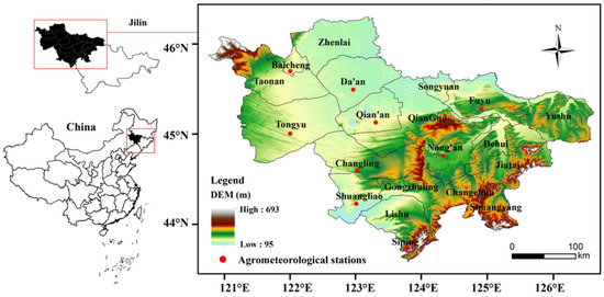 The area around 45th parallel of the northern latitude is the best area in which to grow maize, and at the same latitude, the Ukraine, midwestern USA and northeast China are known as the three golden corn belts. China’s Golden Corn Belt is located in the northeast Plain, with the core area at midwestern Jilin Province. Midwestern Jilin Province is located southwest of Songnen Plain, the western area of the Inner Mongolia Autonomous Region, the northern part of Heilongjiang Province, and the eastern part of Horqin grassland (43°16′–46°18′ N, 121°38′–127°45′ E). The total land area is 8.19 × 104 km2, and the terrain is relatively flat and gradually increases from the west to east. It has a temperate continental monsoon climate with an average annual temperature of 4–6 °C and adequate sunshine. The annual rainfall ranges from 200–600 mm and is primarily concentrated between June and September (Figure 2).