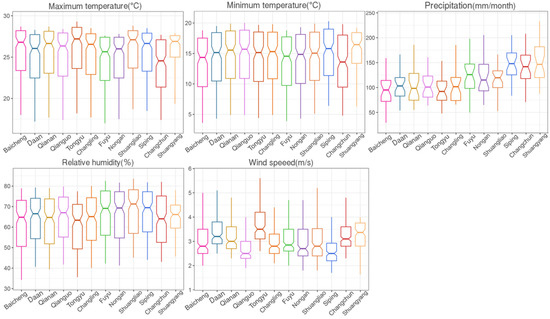 Figure 3 shows the change of climatic conditions in midwestern Jilin Province from 1980 to 2020. The maximum and minimum temperatures were 27 °C and 15 °C, respectively. The relatively low maximum and minimum temperatures in Changchun may be owing to its location at a higher altitude (236.8 m). The optimal temperatures for maize growth are from 25 °C to 31 °C. When the temperature is low, the nutrient consumption of respiration is larger, and the growth of maize is relatively slow. When temperatures get too high, maize stops growing. The trend of a decrease in precipitation decreases from southeast to northwest, and is significantly affected by topography. The monthly mean precipitation distribution is very uneven with approximately 100–170 mm in the southeast and up to 160 mm in local areas, such as Siping and Shuangyang. The precipitation is relatively light in the northwest. The average relative humidity of each county is 60–70%, which is favorable for maize growth. Variations in the wind speed are the result of a combination of many factors, including climate, human activity and built environment, and circulation, and there is no obvious trend in change among the counties.