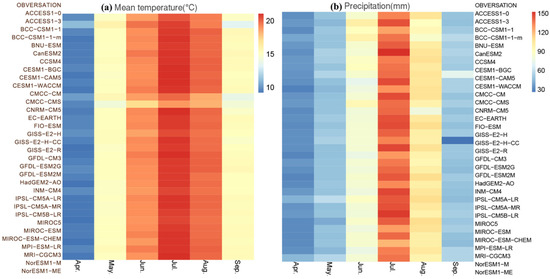 Figure 4. Heat maps of the temperature and precipitation of midwestern Jilin Province between the observations and simulation results for 1980–2020.