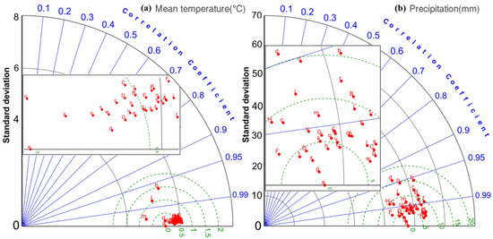 A common method used to determine whether the climate model results are close to observations is to calculate the correlation coefficient and root mean square error between the two. The correlation coefficient (R) focuses on the similarity between the two patterns, while the root mean square error (RMSE) is an assessment of the closeness of the two dispersions. Taylor presented the Taylor diagram at the Program for Climate Model Diagnosis and Intercomparison (PCMDI) technical presentation, which simultaneously plots the correlation coefficient and root mean square error on a two-dimensional graph [48]. The formula is as follows: