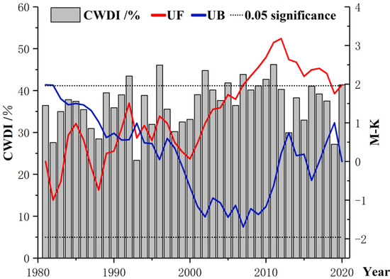 Figure 6. Variation of CWDI in the growing season and using the M−K test.