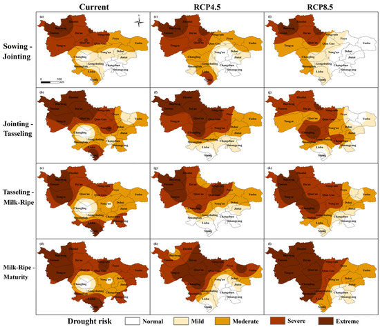 Under the background of global warming, the frequent occurrence and long-term persistence of drought events have substantial negative effects on agricultural production. As the main maize production area in midwestern Jilin Province, frequent drought and a shortage of irrigation water pose substantial threats to the production of maize. We analyzed the balance of water supply and demand in each growth period and the degree of maize yield affected by drought. The results indicate that the FIO-ESM climate model can effectively simulate the changes in temperature and precipitation, and was highly applicable to the study area. From 1980 to 2020, the drought risk indices for the sowing to jointing, jointing to tasseling, tasseling to milk-ripe, and milk-ripe to maturity stages were 0.62, 0.52, 0.48, and 0.60, respectively. In the future, the chances of a RCP8.5 scenario drought risk and an enhanced RCP4.5 scenario have eased. Spatially, the high-risk areas shift in a “west−central−southwest” pattern. Effective precipitation will decrease in the future, while the increasing water requirement of maize increases the dependence on irrigation water. The irrigation requirement index is more than 70% for all periods, particularly in the milk-ripe to maturity stage. The relative meteorological yields were positively correlated with the CWDI of the whole growth period, with the rate of reduction in maize yield and the yield reduction coefficient of variation at a high level of risk between 1980 and 2020. In the future, the negative impact of drought risk on the yield of maize lessened with no obvious trend in production. In particular, the rate of reduction and reduction coefficient of variation for the RCP8.5 scenario were 1.24 and 1.09, respectively.