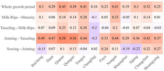 Figure 12. Pearson’s correlation coefficient of CWDI and Yw in maize growth period in midwestern Jilin Province.