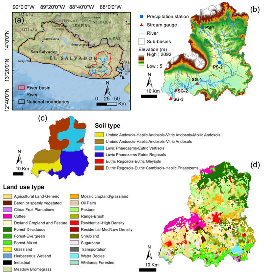 (a) Location of GSM River Basin in El Salvador; (b) topography of the basin and location of hydro-meteorological stations; (c) soil map of the basin and (d) land use map of the basin.