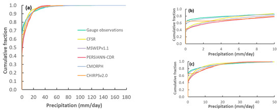 Additionally, the cumulative density function (CDF) of the daily precipitation distribution was computed for the six datasets. The cumulative frequency was evaluated based on the precipitation event classification of the World Meteorological Organization (WMO) standard [55] as presented in Table 3.