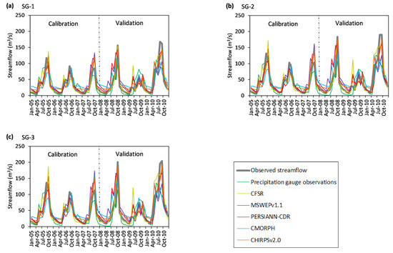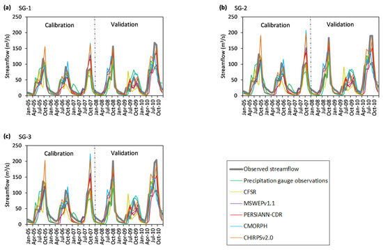 Comparison of simulated streamflow for different precipitation sources and observed monthly streamflow using Table 1. (a) SG-1, (b) SG-2, and (c) SG-3.