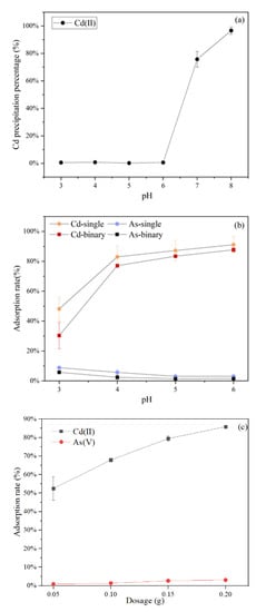The image of the As(V) and Cd(II) precipitation curves: (a) Effects of pH on co-precipitation, (b) biosorption by C. vulgaris for the single and binary solution systems, and (c) adsorbents dosage on adsorption by C. vulgaris for the binary solution systems.