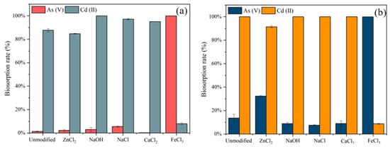 As for S. platensis (Figure 3c), the modification of NaCl had no remarkable effect on the biosorption of As(V) and Cd(II), the difference between the 0.1 to 2 M concentrations was not significant. However, in Figure 3d, the maximum As(V) removal efficiency onto S. platensis was achieved using 1 M ZnCl2 for modification. The biosorption rate of Cd(II) decreased from 100% to 73% with the increasing concentration, while the biosorption rate of As(V) increased from 13% to 50%. At a higher ZnCl2 concentration (2 M), the As(V) biosorption rate decreased to 46%. The reason may be that the modification improved the porosity development of the adsorbent. Additionally, As(V) interacted more easily with the various functionalities on the cell walls of the adsorbent, while the removal of Cd(II) decreased, attributable to the nonexistence of the available biosorption sites.
