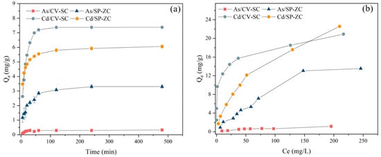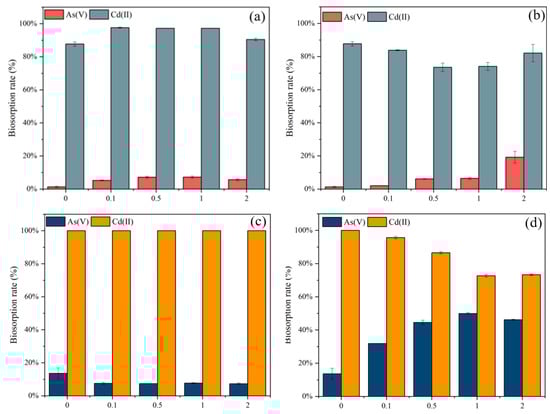 Different modified adsorbents were added to the 30 mg/L As(V) and Cd(II) solution to evaluate the efficacy of the modification on the biosorption of the two metal species. The mixture swirled at a speed of 150 rpm, temperature of 25 °C, and 150 rpm for 4 h in a vertical full temperature oscillation incubator (ZQLY-180V, Zhichu Instrument Co., Ltd., Shanghai, China). After settling, 5 mL of the supernatant was separated using a 0.45 μm membrane filter, and the remaining As(V) and Cd(II) concentrations were determined.