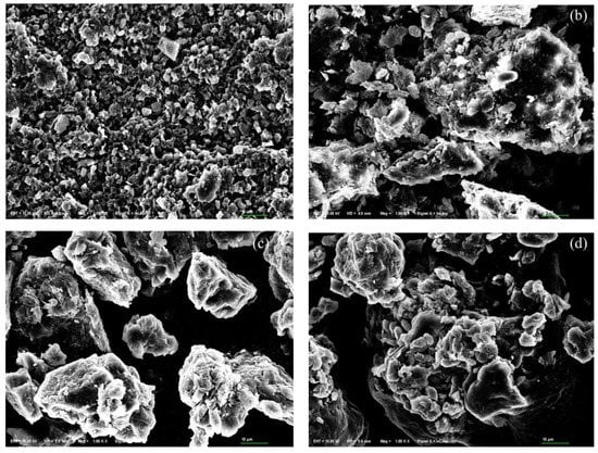 The distinctly different morphological features of unmodified common C. vulgaris and S. platensis is shown in Figure 5. The surface of C. vulgaris is relatively flat and uniformly distributed with many round particles (Figure 5a), with many tiny pores and cavities between these particles. In contrast, S. platensis particles have an irregular shape, with many elongated grooves and larger cavities on the surface (Figure 5c). This structure of S. platensis may allow heavy metal molecules to penetrate more easily into the internal structure and interact with the functional groups on its surface.