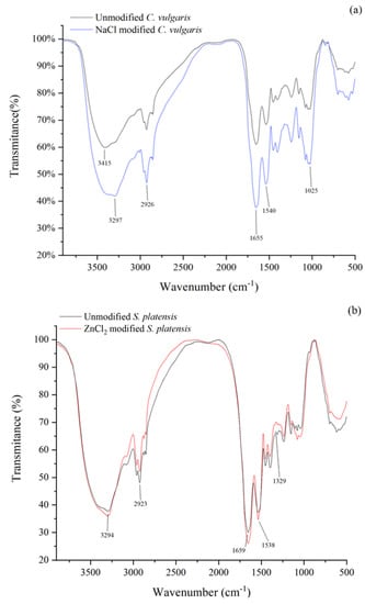 The identification of the various functional groups present on the algae surface was carried out via FTIR spectroscopy. Figure 6 shows the FTIR graph of unmodified and chemically modified algae samples. The FTIR spectroscopic graph indicated an intensity peak at around 3294 cm−1 in all the samples, suggesting the presence of O–H and N–H. The peaks around 2926 cm−1 were ascribed to the C–H stretching vibrations, which could be found in cellulose and lignin []. Additionally, the peaks near 1660 cm−1 were ascribed to the C=O asymmetric stretching. Compared to unmodified C. vulgaris, the strength of the O–H, C–H, and C=O stretching band for NaCl modified C. vulgaris increased (Figure 6a), indicating the increase of these functional groups. Similarly, the C–H and C=O functionalities in the ZnCl2 modified S. platensis exhibited an increased intensity (Figure 6b), demonstrating that the ZnCl2 modification increased the surface area and the functional groups. The FTIR graph showed that the C. vulgaris and S. platensis surfaces were occupied by the hydroxyl, carboxylate, amino, and amide groups, which had a remarkable role during the biosorption process [,].