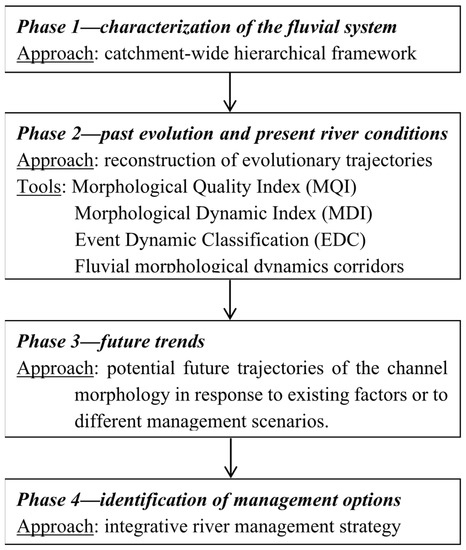 The structure of IDRAIM includes four phases [24], as shown in Figure 1. The characterization of the fluvial system (phase 1), based on a catchment-wide hierarchical framework, provides an initial characterization of the river system in its present conditions, and a segmentation into homogeneous reaches. Assessing the past evolution and present river conditions (phase 2) demands a reconstruction of evolutionary trajectories based on a series of key parameters (channel pattern and width and bed-level changes), as well as the assessment of present river conditions. These are investigated using the Morphological Quality Index (MQI), the Morphological Dynamic Index (MDI), as well as the Event Dynamic Classification (EDC) and the fluvial morphological dynamics corridors [24]. The assessment of future trends (phase 3) considers potential future trajectories of the channel’s morphology in response to existing factors or to different management scenarios. The identification of management options (phase 4) focuses on the establishment of an integrative river management strategy that should take into account the results of the whole analysis.