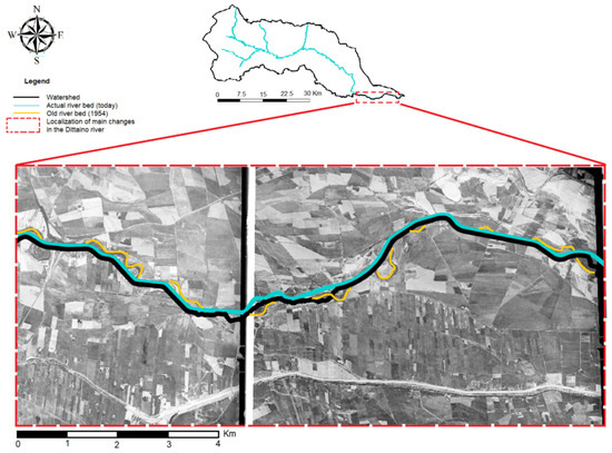 For the Dittaino River network, the MDI was evaluated for each PC/UC reach. The indicators of the categories of morphology and processes and artificiality were evaluated using maps and field survey analysis. The analysis of the indicators V1 (morphological configuration changes) and V2 (width changes), in particular, was carried out by comparing between remote sensing images (Orthophotos 2008) and maps of the flight IGM GAE of 1954/55, provided by the Military Geographical Institute (Figure 2). The poor definition of the maps led to some difficulties during the interpretation of the results.