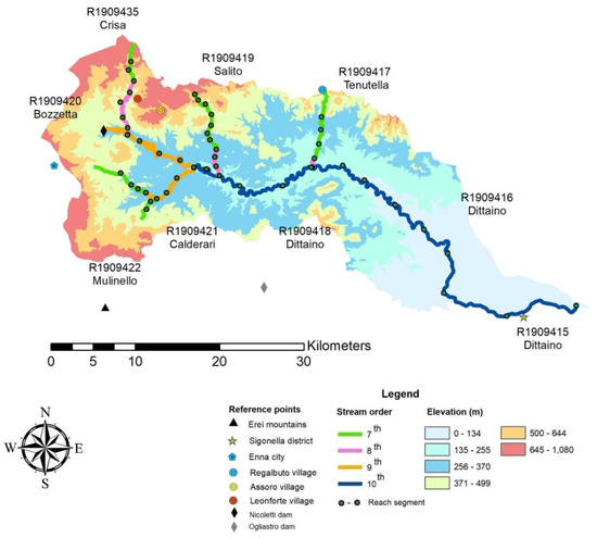 In the step 1, a basic investigation of geology, geomorphology, climate, and land use in the whole catchment was carried out. An initial segmentation (editing of lines) was then constructed based on physiographic units, hydrological discontinuities, significant geometric changes, and variations in geolithology. The subdivision was performed through the software Arc Hydro Tools (ArcGIS 10.3, ESRI®) using orthophotos (flight ATA 708 of 2008), provided by the Sicily Region Department of Territory and Environment, the Digital Terrain Model (DTM) (format ASCII), Technical and Geolithological Maps of Sicily (both available on the Regional Geoportal), and the Map of Regional Physiographic Units (available on the website of the Italian National Institute for the Environmental Search and Protection, I.S.P.R.A.) [34]. Slope and exposure maps were derived from the DTM. The Dittaino catchment was then divided into physiographic units and its fluvial system was divided into distinct segments, also taking into account the main confluences of its tributaries.