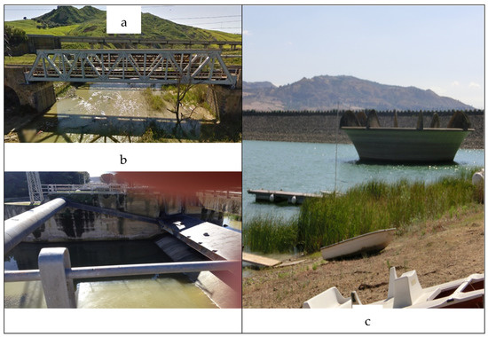 The study area. (a) Dittaino River; (b) abstraction weirs; (c) Nicoletti dam.