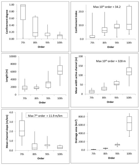 As expected, all the parameters showed increasing values and variability (difference between quartiles) with increasing reach order, with the exception of the confinement degree and the mean channel slope (Figure 5). Very high variability in the confinement degree and mean channel slope was observed for the seventh and eighth reach orders compared with the ninth and tenth reach orders. On the other hand, very low variability in the confinement index and the drainage area was observed for seventh, eighth and ninth reach orders compared with the tenth reach order. Moreover, the maximum value of the mean width of the active channel (calculated for each reach and equal to 328 m) was very different from the second highest value (equal to 153 m). The highest value of the mean width of the active channel was found in ID reach 107 of the Bozzetta river and it is the only anabranching channel (data not shown). The maximum mean channel slope value (equal to 11.90 m/km) was found for ID reach 101 of the Salito stream (data not shown). The maximum confinement index value (equal to 34.2) was found for ID reach 103 of the Dittaino stream (data not shown). The maximum drainage area (equal to 882 km2) was found for ID reach 202 of the Dittaino stream (data not shown).