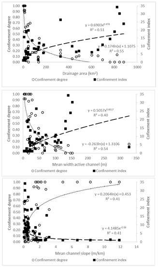 The confinement degree of all reaches was correlated (by a logarithmic equation) negatively with the drainage area and the mean width of the active channel (R2 = 0.55 and 0.54, respectively), while it was positively correlated with the mean channel slope (R2 = 0.41). On the other hand, the confinement index of all reaches was correlated (by a potential equation) positively with the drainage area and the mean width of the active channel (R2 = 0.51 and 0.40), and negatively with the mean channel slope (R2 = 0.41) (Figure 6).