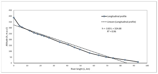 In order to characterize the Dittaino’s watershed stage, regressions, including linear, exponential logarithmic, and power of the longitudinal river pattern profile, were established. The coefficient of determination (R2) calculation determines the degree of fit. The curve with the highest R2 value is the best curve. If the sediment is too coarse to be transported by the river, the longitudinal profile shows a low degree of concavity and hence a better linear function fit [40]. If the transport capacity is saturated, as postulated by [41], the channel sediment grain size will reduce downstream, and the longitudinal profile will be more suitable for the logarithmic function. With further increases in profile concavity, the power function becomes more appropriate. Thus, the temporal evolution sequence should be as follows: linear–exponential–logarithmic–power.