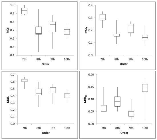 Considering the statistical distribution of MQI and its sub-indices MQIF and MQIA, the values were shown to decrease with increasing order (Figure 8), with the exception of the ninth-order reaches, which attained higher values than the eighth-order reaches on average. Contrarily, the statistical distribution of the sub-index MQICA did not show a clear trend, with the minimum value being attained by the ninth-order reaches (Figure 8). In particular, the lowest values of MQICA were found for Caldeari (considering both seventh- and ninth-order reaches), while the highest values were found for the Dittaino River (Table 7). This may be because MQICA has been defined for channels with widths greater than 30 m [20].