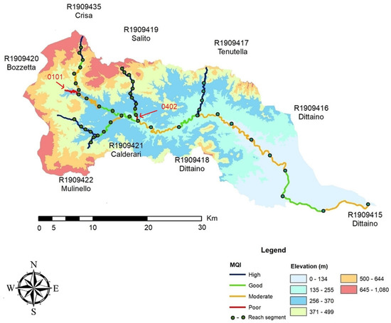 Elevation of the Dittaino basin, hydrograph segmentation and MQI evaluation results, and poor MQI reach number identification.