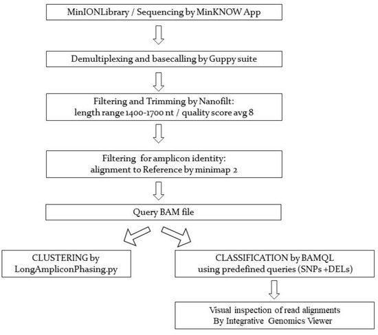 The workflow for library preparation, nanopore sequencing, and data analysis is shown in Figure 1. Nanopore sequencing was performed at Bio-Fab Research (Rome, Italy) using a MinION sequencer. Libraries were prepared using the cDNA-PCR Sequencing kit (SQK-PCS109) from Oxford Nanopore Technologies (Oxford, UK) following the manufacturer’s instructions, combined with the Native barcoding (EXP-NBD104) kit. MinION flow cells (FLO-MIN106 R9.4.1) were loaded with 50 fmol of pooled libraries and sequencing was carried on over 17 h using the MinKNOW software 3.6.5. The raw data (FAST5 files) were base called using the high-accuracy models (dna_r9.4.1_450bps_hac.cfg) and then demultiplexed by Guppy basecalling suite v3.6.1 + 249406c on Ubuntu 18.04 machine, to obtain the final FASTQ files. Filtering parameters were applied to select only for reads preserving the 5′ and 3′ adaptors. Subsequently, reads were selected for a length range consistent with the PCR amplicon product (1400–1700 bases), and for an average quality equal or above 8. In order to eliminate non-specific signals, individual sequence reads were mapped to the SARS-CoV-2 reference sequence (NC_045512) and only reads aligned with this reference were used for further analysis. The resulting BAM file was the input of the subsequent analysis for amplicon assignation. Both unsupervised and supervised approaches were used for NGS reads assignment.