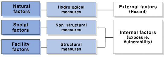 The flood damage drivers can be classified into natural, social, and facility factors. Another way to classify these drivers is to divide them into structural, nonstructural, and hydrometeorological factors, as shown in Figure 1. Moreover, these factors can be represented as external and internal factors. The instance of an external factor is when the localized heavy rain and sea level increase because of climate change and cause natural disasters. Meanwhile, an internal factor is when the population growth and the spread of unplanned urban development triggers a natural disaster [20]. As the correlation between these factors is continuously increasing, the scales of disasters are also broadening.