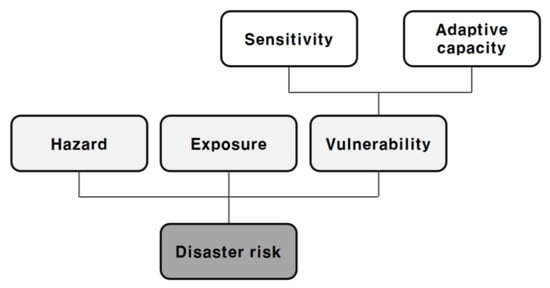 Disaster was assessed according to the conceptualization of vulnerability in the Fourth Assessment Report (AR4) of the IPCC. In IPCC AR5, vulnerability evolved into the concept of risk [29]. In this study, the concept of risk from IPCC AR5 was used to develop a model for deriving a disaster risk index and map. We agree that a conceptualization of disaster risk should consider all aspects of disasters including hazard, exposure, and vulnerability, as well as all time periods, as shown in Figure 3. Based on the concept, disaster risk was assessed on the basis of its hazard, exposure, and vulnerability features [30].