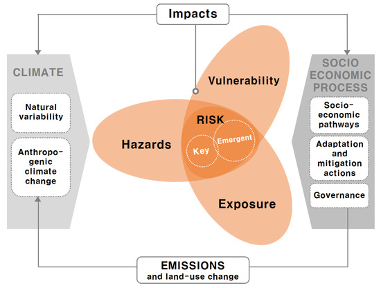 The IPCC AR5 risk concept has been developed around the central term ‘risk’. In this concept, risk is a result of the interaction of vulnerability, exposure, and hazard (Figure 4) [29]. The risk of climate-related impacts results from the interaction of climate-related hazards (including hazardous events and trends) with the vulnerability and exposure of human and natural systems.