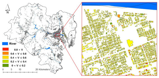 The urban flood vulnerability analysis results are given in Table 5. The fuzzy values revealed the vulnerability level of each building with regard to flood damage split into five stages. We classified the buildings according to their vulnerability level using different color codes (very low vulnerability—green, low vulnerability—lime green, medium vulnerability—yellow, high vulnerability—orange and very high vulnerability—red). The results of the vulnerability analysis are shown on the map of the Ulsan City in Figure 6.