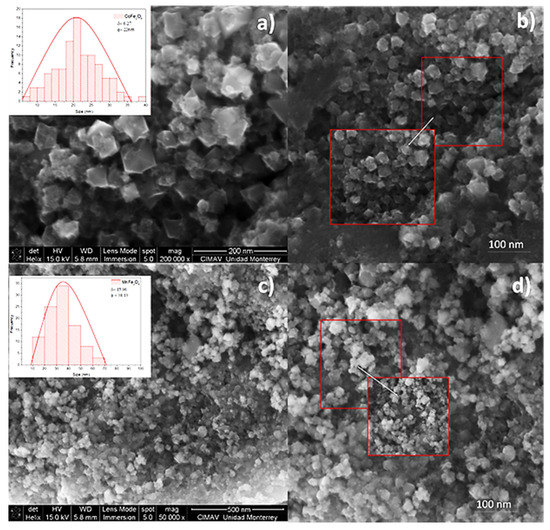 The size and morphology of the two magnetic nanoparticles synthesized were determined by scanning electron microscopy (SEM). According to the images and histograms, the samples consist of nanoparticles with relatively uniform size and quasi-spherical morphology (Figure 1a–d).