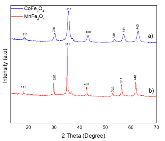 The XRD patterns of CoFe2O4 and MnFe2O4 are shown in Figure 2. Figure 2a shows the diffraction peaks for the CoFe2O4 sample, located at the 2θ values of 18°, 30°, 36°, 43°, 57°, and 62° with the respective crystal planes (111), (220), (311), (400), (511), and (400), corresponding with the card JCPDS-22-1086 [15]. Figure 2b corresponds to the MnFe2O4 sample, and the peaks 2θ to 30.31°, 36.60°, 44.57°, 58.68°, 57.12°, and 65.78° are indexed to planes (220), (311), (400), (511), and (440), matching the cubic structure centered on the face of MnFe2O4, according to the International center diffraction data card, JCPDS- 742403 [22].