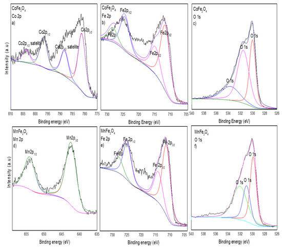 The high-resolution spectra of the samples are shown in Figure 3a–f. The energy levels to analyze correspond to Co 2p, Fe 2p, and O 1s for the CoFe2O4 sample, and Mn 2p, Fe 2p, and O1s for the MnFe2O4.