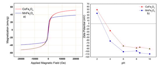 (a) Hysteresis cycle of CoFe2O4 and MnFe2O4, and (b) Zeta potential as a function of pH of CoFe2O4 and MnFe2O4.