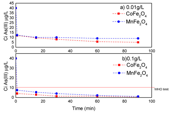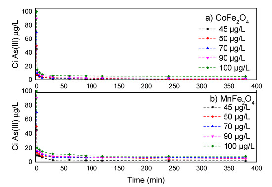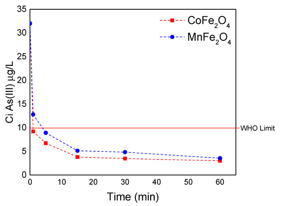 In addition, with a less adsorbent dose (CoFe2O4, 0.2 g/L), Zhang (2010) reported 90% (As(III)) maximum removal efficiency in twelve hours [33]. In the present study, after 30 min with the adsorbent dose of 0.1 g/L, a final As concentration below 25 µg/L (Mexican regulations for drinking water [34]) was reached with both MNPs. In contrast, Podder (2015) reports 86 % As(III) removal with MnFe2O4 after 80 min and an adsorbent dose of 2 g/L [34]. Furthermore, Iconaru (2016) reported maximum removal efficiency of 70% after 24 h of contact time with Fe3O4 (2 g/L) for As(III) [35].