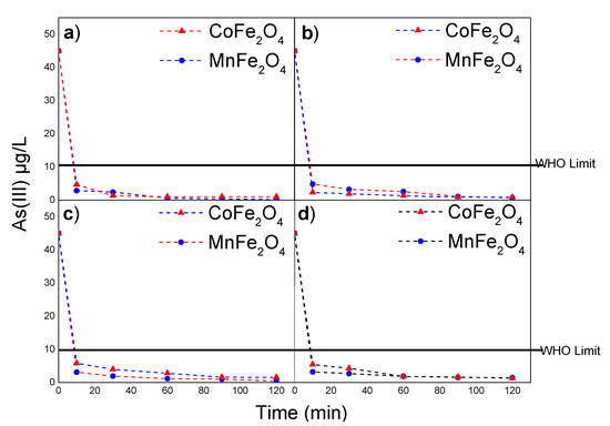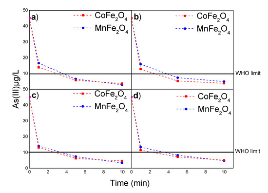 pH effect on the adsorption with CoFe2O4, MnFe2O4, (a) pH 6, (b) pH 7, (c) pH 8, and (d) pH 8.5. As(III) Ci 45 μg/L.