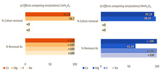 Figure 9a shows the competing cations found in Durango’s groundwater (Na+, K+, Mg+, and Ca+) and their effect on As (III) adsorption, using CoFe2O4. Even if the present ions can compete directly for the surface adsorption sites and indirectly influence the As (III) adsorption by altering the electrostatic charge of the solid surface, their presence did not have a detrimental effect on As (III) adsorption capacity of CoFe2O4. In contrast, competition with Mg+ was observed when MnFe2O4 was used for As (III) removal, and this could be attributed to both similar charge properties at the working pH (pH 8). However, this was observed only in the presence of Mg+ and not for the other cations (Na+, K+, and Ca+) (Figure 9b).