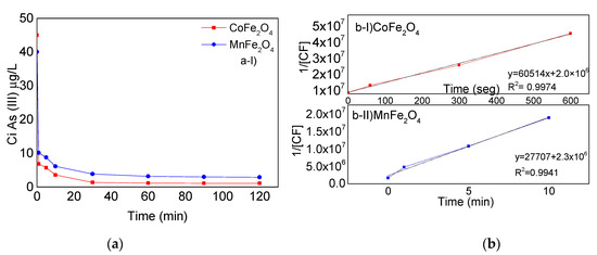 In this study, As (III) adsorption kinetics were performed to explore the adsorption rate. Figure 11a shows the changes of As (III) concentration in the solution against time for CoFe2O4 and MnFe2O4. The As (III) adsorption was fast in the first 10 min, then it slowed down until the equilibrium was reached, at 30 min. The quick initial As (III) adsorption could be due to the nanoscale particle size of the adsorbents, since the fine particles favored the As (III) diffusion from the solution towards the active sites of the adsorbents [40]. First- and second-order equations [41] were used to describe the As (III) adsorption in these MNPs, and the best linear fit was obtained with the second-order reaction model (Figure 11b).