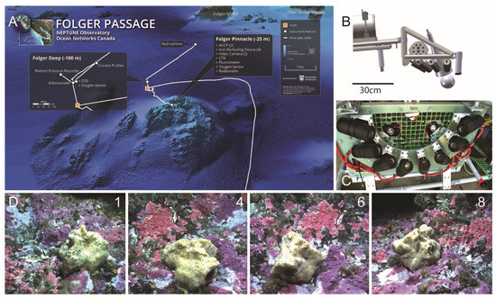 Data were collected from an underwater platform connected to the Ocean Networks Canada NEPTUNE cabled observatory (https://oceannetworks.c, accessed on 20 June 2019). There are two oceanographic instrument platforms at this site, Folger Pinnacle and Folger Deep at 23 m and 100 m respectively, off the southwest coast of Vancouver Island (Figure 1). The location is 10 km west of the Bamfield Marine Science Center (BMSC) in British Columbia, Canada, at the entrance to Barkley Sound. Both video imagery and ancillary oceanographic data collected for this study were from the Folger Pinnacle platform. The environmental parameters of interest, all measured at a 1 Hz sampling frequency, were temperature, salinity, photosynthetically active radiation (PAR), current direction and velocity, chlorophyll content and ambient pressure. A video camera system was positioned to observe a fist-sized demosponge, Suberites concinnus. The system was in fact an eight-stage camera array evenly distributed around a 30 cm radius semi-circle (180°) allowing 3D image reconstruction [29]. Two LED lights with a combined 400 lumen output provided illumination during video recording (Figure 1). Between 2012 and 2015 six different still image time lapse series with images captured each hour were collected (TL1 to TL6; Table 1).