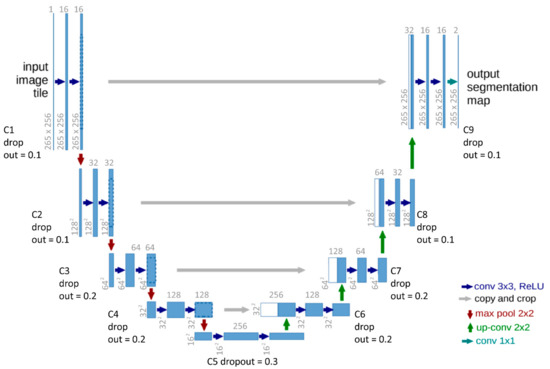 For each layer there is the pixel size (for example 256 × 256) and the dimension depth of applied features/filters (for example the 16 in C1). Conv 3 × 3 ReLu is the activation function within each layer. The ‘copy and crop’ is the concatenation of the contracting (encoder) path to the expansion (decoder) path. The max pool layer of 2 × 2 is the size of the filter applied at each layer. A detailed explanation is found in Section 3.1 CNN and Unet explanation. The original diagram from Ronneberger et al. [32] was modified to demonstrate the alterations for this investigation (Figure 2).