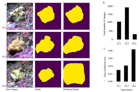 Nevertheless, there are some considerations regarding the use of this technique to answer scientific questions that we learned early on in the process of creating this methodology. For example, ground-truthing the data requires a significant initial time investment. As described above for each time series, there was a manual process of masking the two classes of ‘sponge’ and ‘not sponge’, called ground-truthing. We accomplished this by randomly selecting 40% of the images in each time series (Table 1). Another consideration is the need for a relatively large data set. The performance of the model was closely correlated with the number of images within the time series. For example, TL6 had 316 images and had a validation ASL of 0.6250, 0.3696, and 0.3465 while TL1 and TL5 had 1072 and 1932 images, respectively, with validation ASL’s of 0.505, 0.9477, 0.9616, and 0.1140, 0.8863, 0.9429, respectively (Table 1 and Table 2).