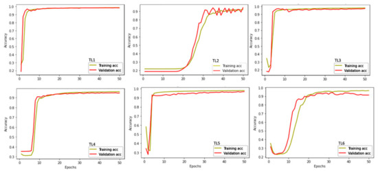 In the accuracy learning curves we see that TL1, TL3, TL4 and TL5 all demonstrate an ideal goodness of fit (Figure 4). Whereas TL2 and TL6 are slightly different. TL2 is noisy at the end of the model (higher epochs) and in TL6 the accuracy started to decrease over time; both of these trends are indicative of some overfitting (Figure 4). In the loss learning curves, we see that TL3, TL4 and TL5 all demonstrate a good-fit curve (Figure 5). TL1, TL2, and TL6 have a fair amount of noise in the validation data (red lines in Figure 5). Both TL1, and TL6 have higher loss values, whereas TL2 validation data has a lot of noise (fluctuations). All three of these trends over time (epochs) indicate some form of unrepresentative training data (Figure 5). TL2 and TL6 support the findings from the accuracy learning curve of overfitting; however, the TL1 loss curve differs from the accuracy curve suggesting a small amount of overfitting in the model (Figure 5).